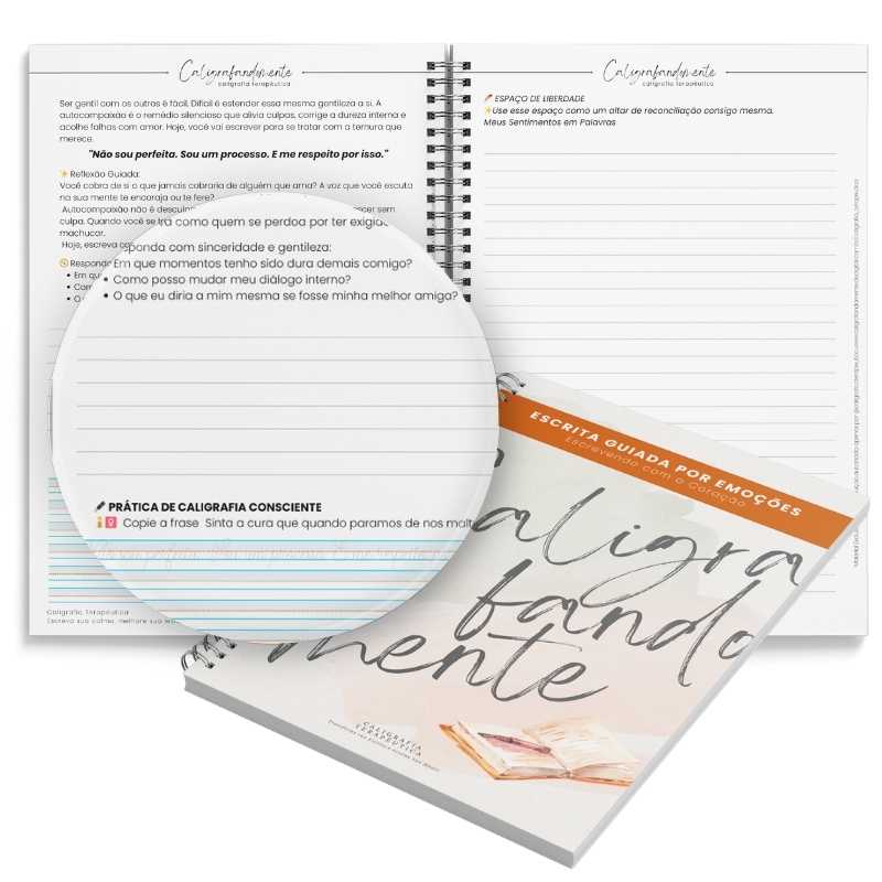 Através de exercícios de caligrafia guiada, frases terapêuticas e reflexões curtas, você aprende a usar o ato de escrever como uma forma de meditação ativa.